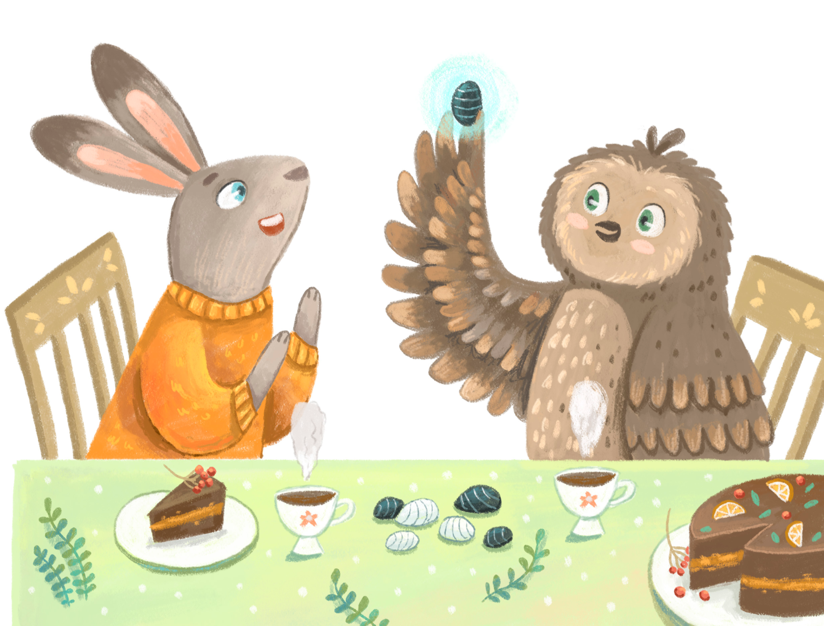 Обратная дорога казалась знакомой и лёгкой. Добрый Филин снова перенёс друзей через реку, а Зайка ему в благодарность чудо-семечко подарил. А к вечеру уже и домой добрались.