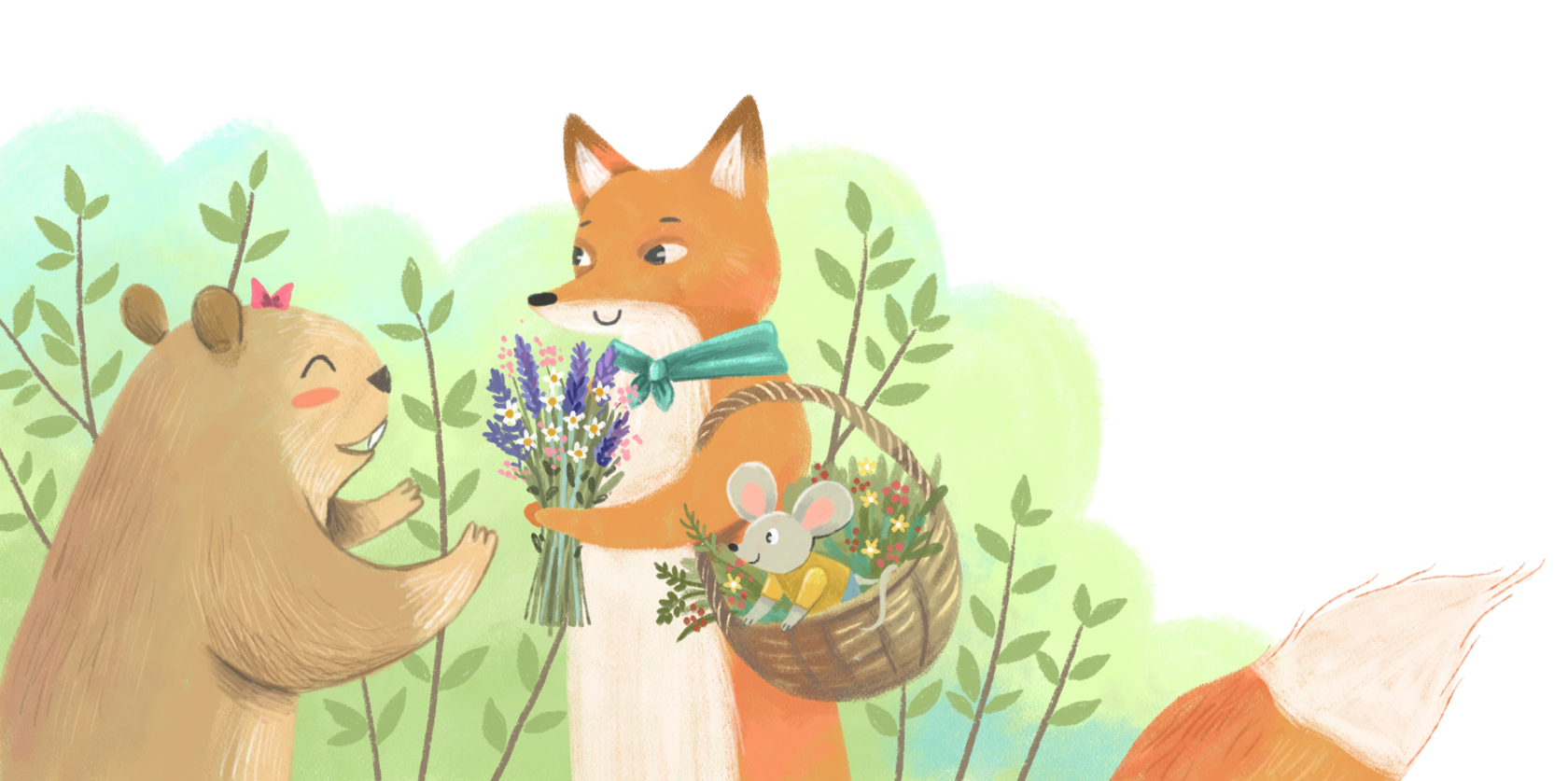 Ранним утром яркие солнечные лучики заиграли на листьях, защекотали сонные мордочки. Птицы громко щебетали, радуясь солнышку и новому дню. Проснулись и Зайка с Мышонком. Поели сочных, сладких ягод и двинулись в путь.